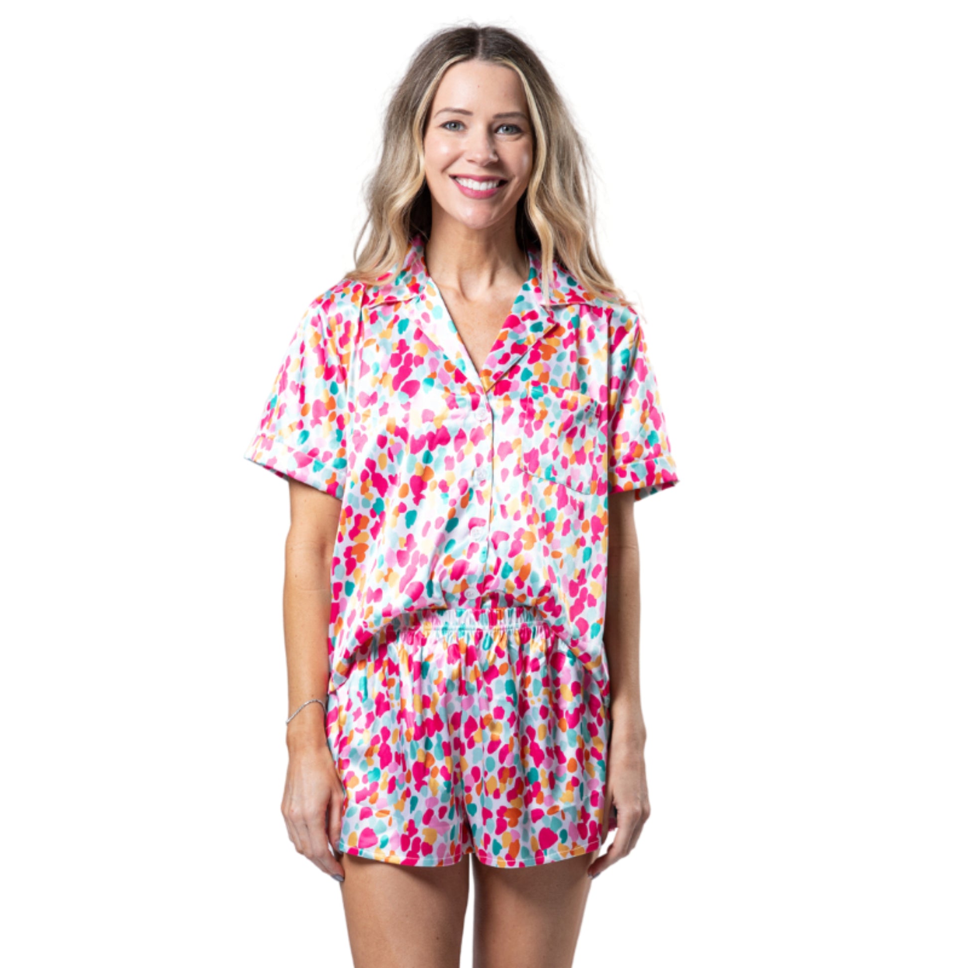 Confetti Bloom Satin Pajama Short Set, 97% Polyester, 3% Spandex