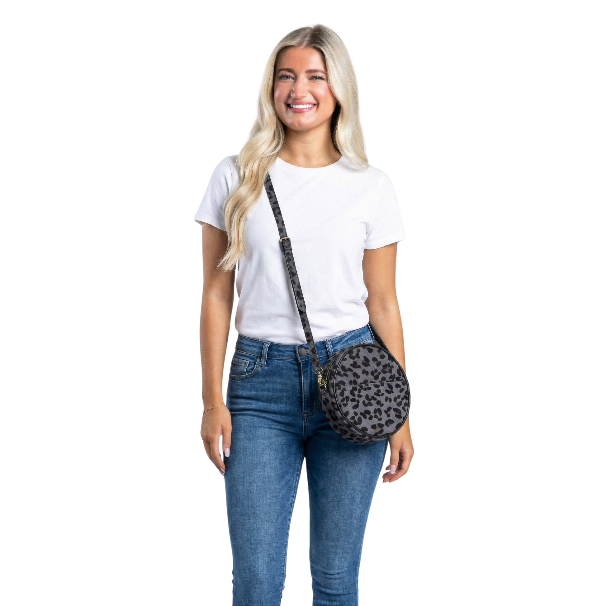 The Dottie Round Crossbody in Grey Leopard Hair-On is your new go-to accessory for hands-free sophistication. This compact yet spacious crossbody bag features genuine hair-on leather with a striking grey leopard print that adds a touch of wild elegance to any outfit.