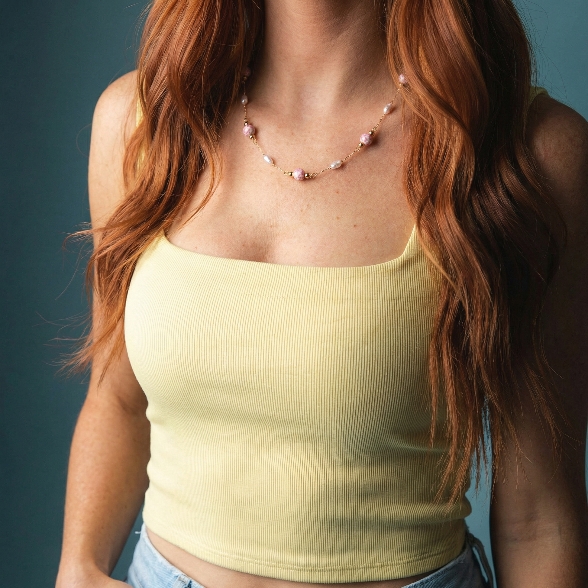 Pink Floral Bead and Pearl Stations Paperclip Necklace