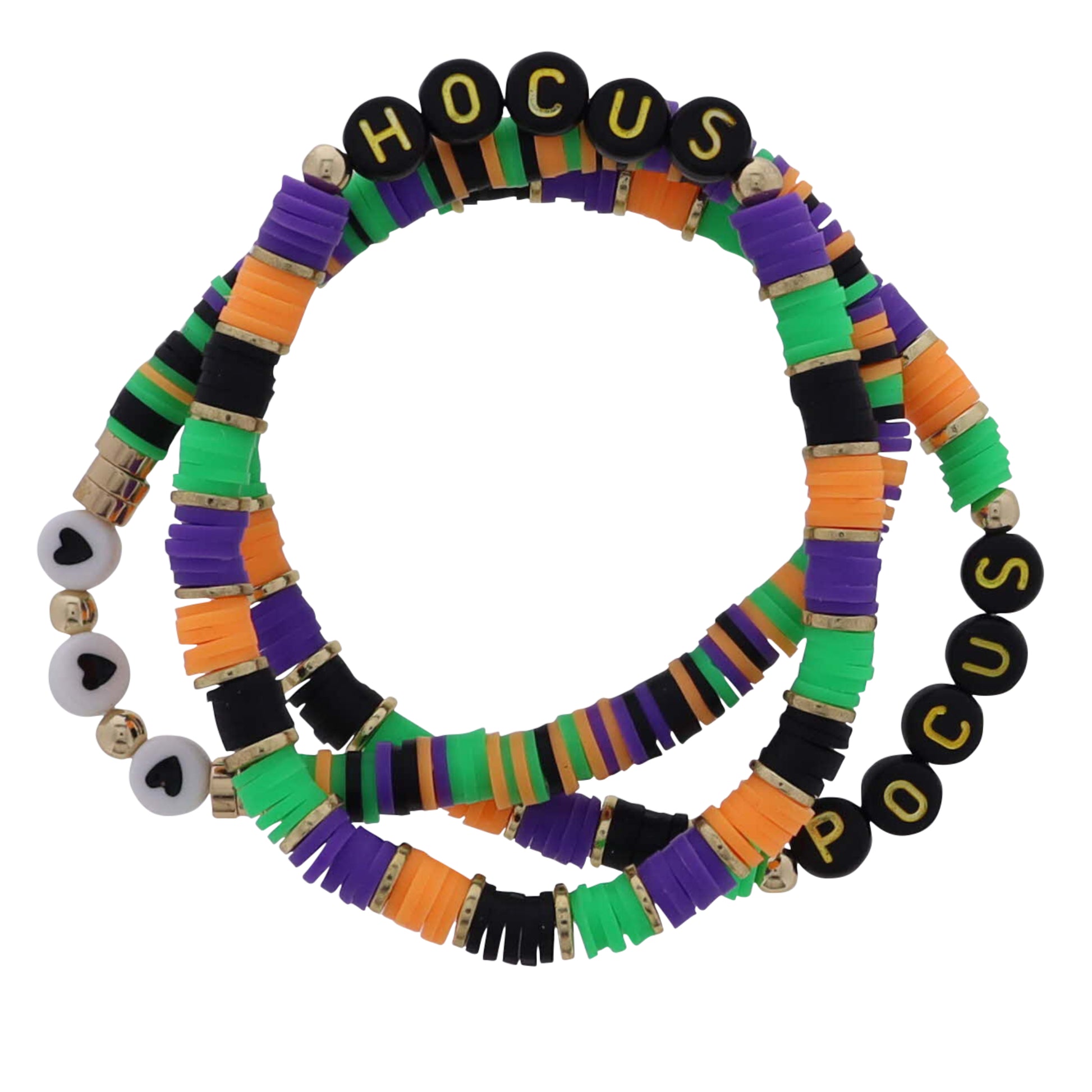 Set of 3 Green, Orange, Purple, Black Rubber Disk Beaded Bracelets with Hearts & "Hocus Pocus"